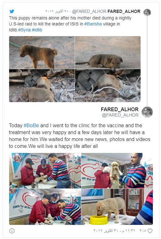 وعثر الهور على الكلب الجرو "بوبي" وهو يقف بجانب جثة والدته، في صباح اليوم التالي للغارة الأمريكية المزعومة التي قيل إنها استهدفت مكان تواجد البغدادي في ريف إدلب، حيث سمع المصور صوت عواء ضعيف أثناء تجوله في المكان، ليفاجأ بجرو صغير مغطى بالأتربة تقترب أنفاسه من الموت بسبب الجوع.
