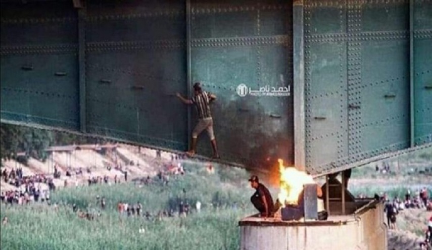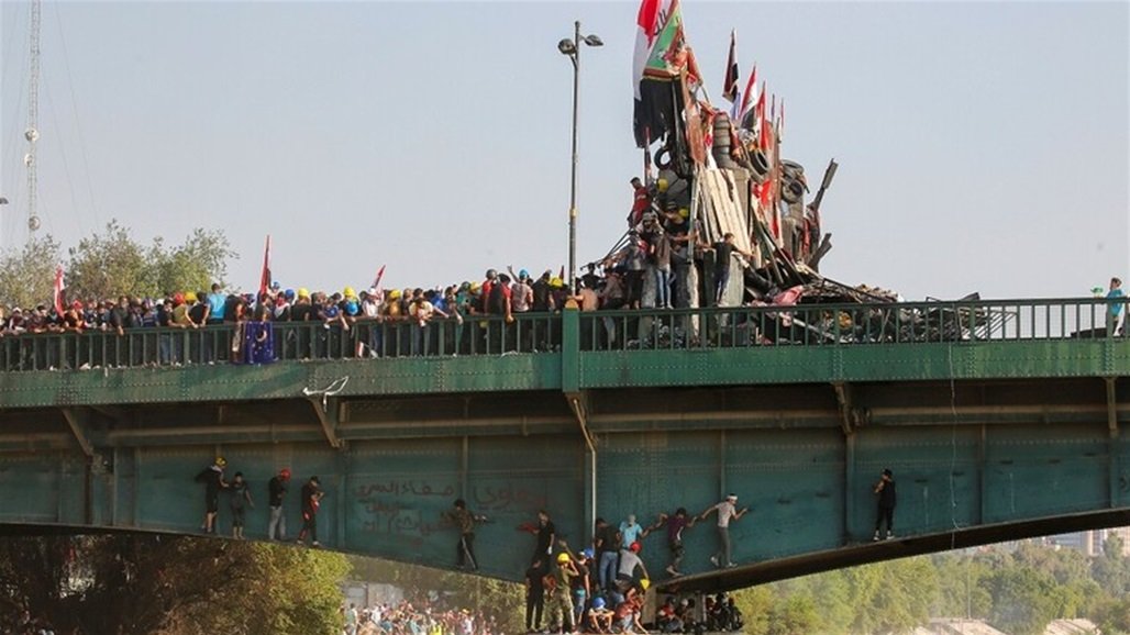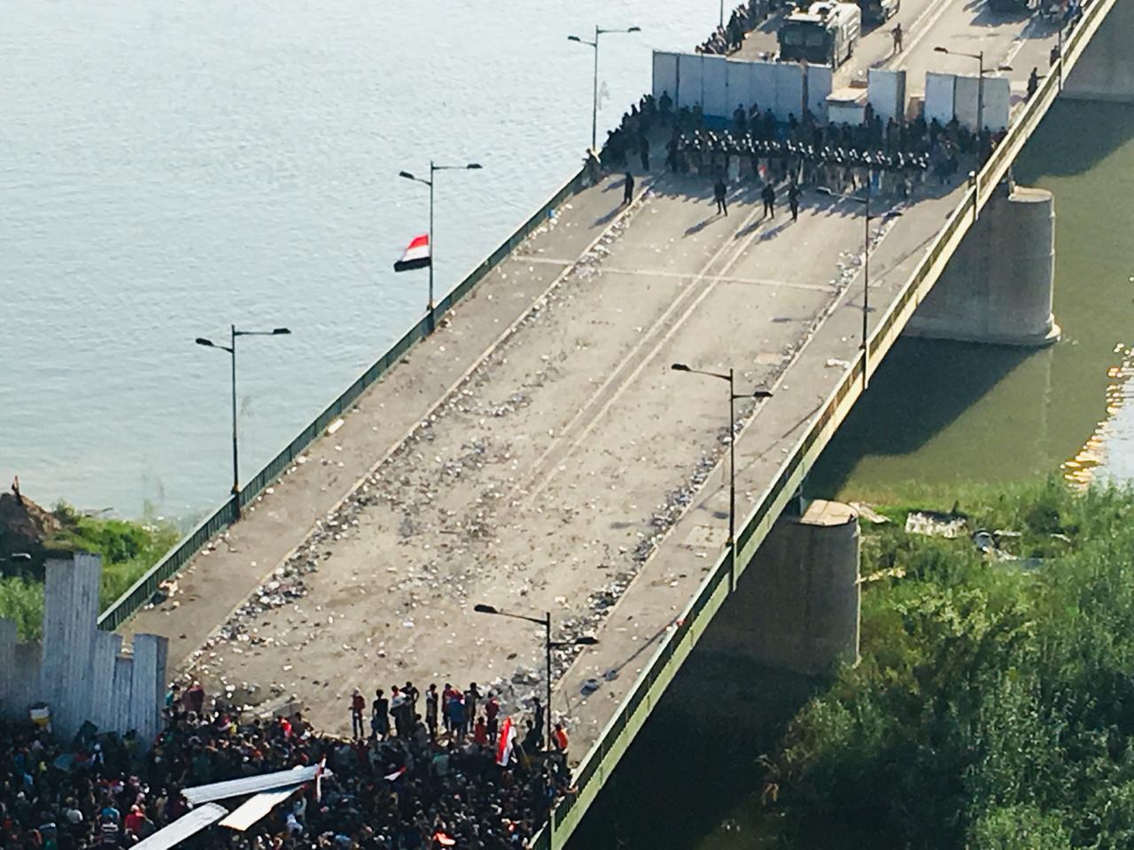 ويشهد الجسر الذي يربط ساحة التحرير بالمنطقة الخضراء وسط بغداد، تظاهرات احتجاجية واسعة، منذ الاول من تشرين اول الحالي، حيث يحاول مئات المتظاهرين العبور الى المنطقة المحصنة، فيما ترد قوات مكافحة الشغب بالقنابل المسيلة للدموع.