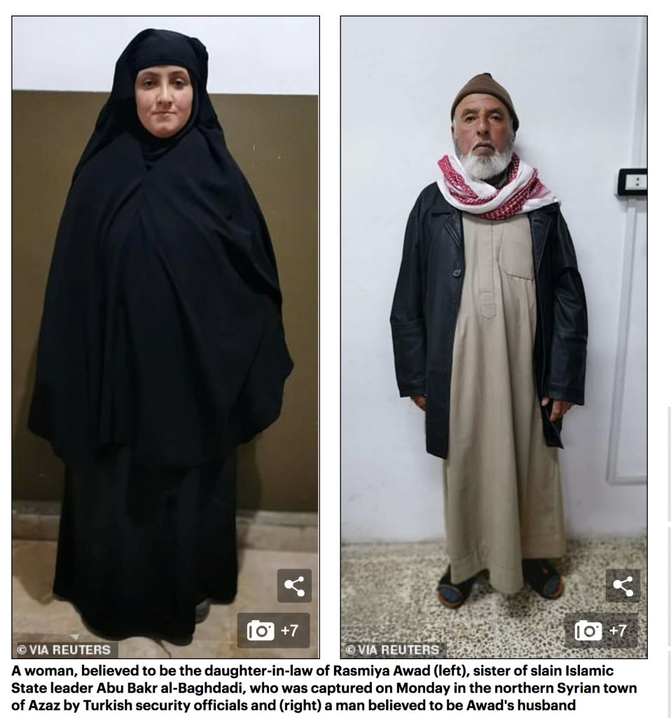 وقال المسؤول التركي “ألقي القبض على رسمية عواد عند مداهمة حاوية قرب أعزاز… نأمل أن نستخلص معلومات ثمينة من شقيقة البغدادي عن العمل داخل داعش”.