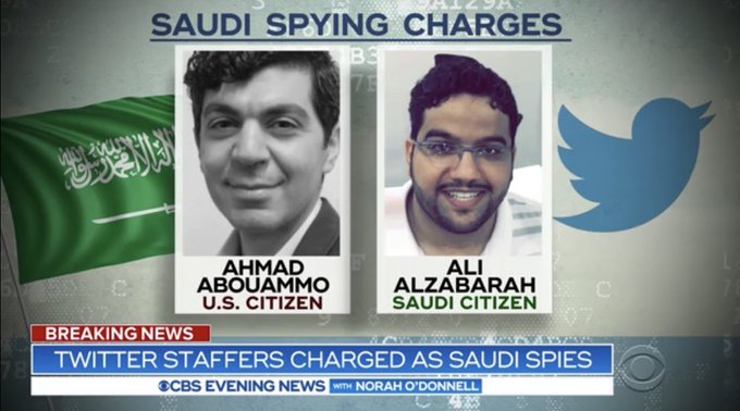 ووفقاً للشكوى التي قُدمت، الأربعاء 6 نوفمبر/تشرين الثاني 2019، يواجه (علي الزبارة وأحمد أبوعمو)، اللذان كانا يعملان في تويتر، وأحمد المطيري، الذي كان يعمل آنذاك لدى العائلة المالكة السعودية، تهماً بالعمل لصالح المملكة دون تسجيل أنفسهم كعملاء أجانب.