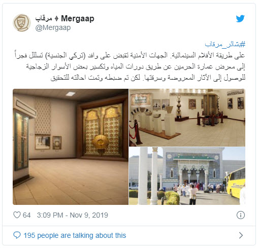 ونقلت صحيفة "سبق" عن مصادر مطلعة أن الوافد التركي تسلل إلى عمارة الحرمين الشريفين في منطقة أم الجود بمكة المكرمة في محاولة لسرقة الآثار، مشيرة إلى أن كاميرات المراقبة رصدته ونجحت الجهات الأمنية في القبض عليه.