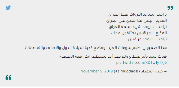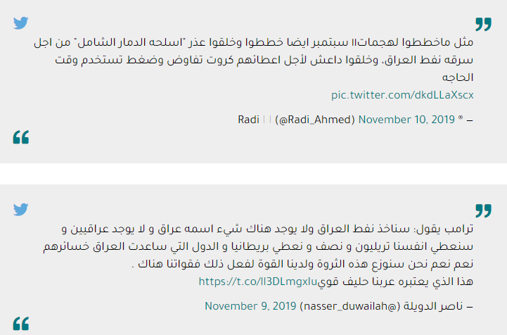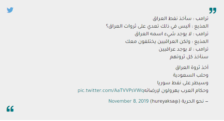 في مقابلة أخرى يقول ترامب: "أنا سآخذ ثروتهم، سآخذ النفط"، ويقول له المذيع: "أليس بهذه الطريقة أنت تدمر ثروة العراق؟ فيقول ترامب: "لا لا دعني أقول لك شيئاً، لا يوجد شيء اسمه العراق، لا يوجد شيء اسمه العراق، قادتهم فاسدون ولا يوجد عراقيون، إنهم مقسمون إلى فصائل مختلفة، سأضع حلقة حماية حول الشركات النفطية لتأخذ كل الثروة وهذا ما يجب فعله".