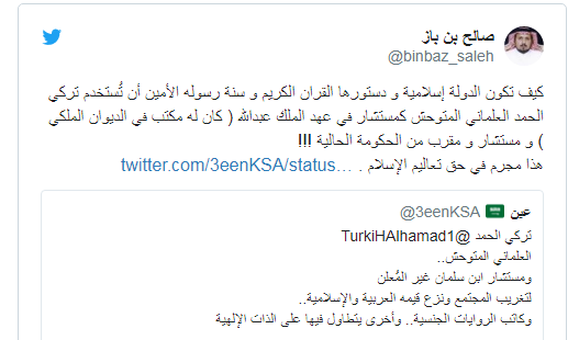 وكتب إبن باز على حسابه في "تويتر": "لو كان تركي الحمد يعيش في دولة إسلامية حقيقية لكان مصيره الإعدام بعد الاستتابة".
