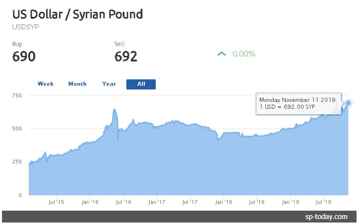 وسجلت الليرة السورية خلال الأزمة أدنى مستوياتها على الإطلاق منذ استقلال البلاد، وفي ما يلي رسم بياني يظهر منحى تطور العملة السورية في السوق السوداء خلال العام الماضي: