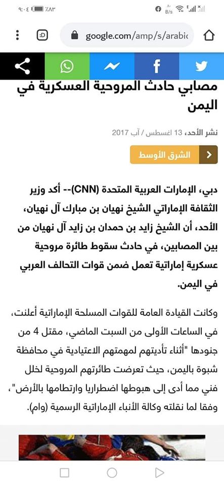 ,بعد نشر وسائل اعلام اماراتية امس الاثنين، لصورة الأمير “زايد بن حمدان صهر محمد بن زايد زوج بنته” وهو مشلول الحركة على كرسي متحرك كشف الحسني عن معلومات موثقة عن إصابة الامير زايد إثر سقوط طائرة امارتية في شبوة كان على متنها.