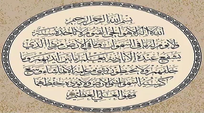 ﴿ اللَّهُ لَا إِلَٰهَ إِلَّا هُوَ الْحَيُّ الْقَيُّومُ لَا تَأْخُذُهُ سِنَةٌ وَلَا نَوْمٌ لَهُ مَا فِي السَّمَاوَاتِ وَمَا فِي الْأَرْضِ مَنْ ذَا الَّذِي يَشْفَعُ عِنْدَهُ إِلَّا بِإِذْنِهِ يَعْلَمُ مَا بَيْنَ أَيْدِيهِمْ وَمَا خَلْفَهُمْ وَلَا يُحِيطُونَ بِشَيْءٍ مِنْ عِلْمِهِ إِلَّا بِمَا شَاءَ وَسِعَ كُرْسِيُّهُ السَّمَاوَاتِ وَالْأَرْضَ وَلَا يَئُودُهُ حِفْظُهُمَا وَهُوَ الْعَلِيُّ الْعَظِيمُ ﴾ .
