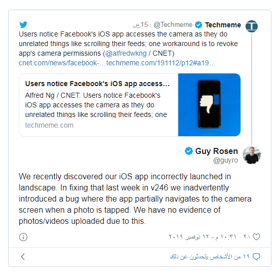 وكتب مادوكس في تغريدة على حسابه في "تويتر": "وجدت مشكلة متصلة بالخصوصية والأمان في فيسبوك. حين يكون التطبيق مفتوحا، فإنه يستخدم الكاميرا بنشاط. لقد وجدت ثغرة في التطبيق تسمح لك برؤية الكاميرا، وهي تعمل في الخلفية أثناء تصفح "آخر الأخبار"، وفقا لشبكة "سي إن إن" الأمريكية.