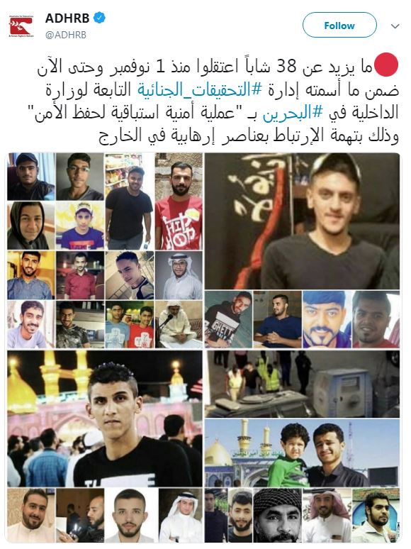 وكتبت المنظمة على صفتحها على موقع التواصل الاجتماعي تويتر ان ما يزيد عن 38 شاباً اعتقلوا منذ 1 نوفمبر وحتى الآن ضمن ما أسمته إدارة "التحقيقات_الجنائية التابعة لوزارة الداخلية في #البحرين بـ "عملية أمنية استباقية لحفظ الأمن" وذلك بتهمة الإرتباط بعناصر إرهابية في الخارج.
