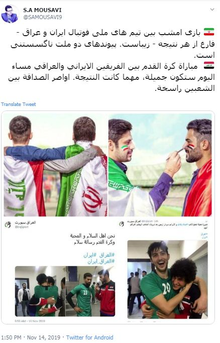 واشار المتحدث باسم الخارجية الايرانية عباس موسوي في تغريدة على تويتر (باللغتين الفارسية و العربية) الى المباراة المرتقبة بين المنتخبين الايراني والعراقي وكتب يقول "مباراة کرة القدم بین الفریقین الایراني والعراقي مساء الیوم ستکون جمیلة، مهما کانت النتیجة. اواصر الصداقة بین الشعبین راسخة".