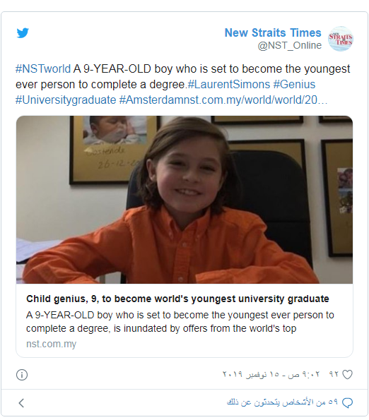 يصفه أساتذته بـ"الإسفنج" لقدرته الكبيرة على امتصاص وتلقي المعلومات، في الوقت الذي لم يستطع فيه الأساتذة الحصول على تفسير لهذه القدرة الهائلة لابن 9 أعوام، لوران سيمونز، في حفظ المعلومات الغزيرة.