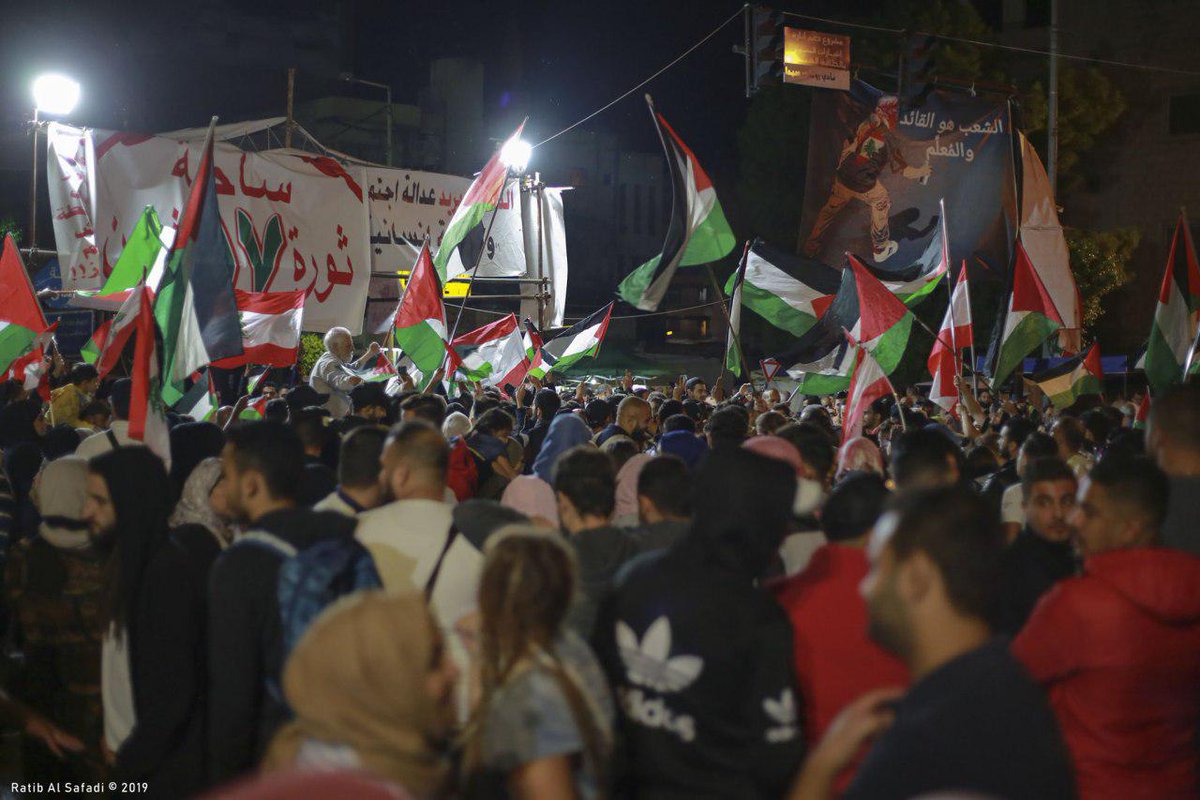 واحتشد الآلاف من اللبنانيين والفلسطينيين في الساحة حاملين الأعلام اللبنانية والفلسطينية، على وقع الأناشيد الوطنية، موجهين التحية للمقاومة الفلسطينية ولأرواح الشهداء والجرحى.