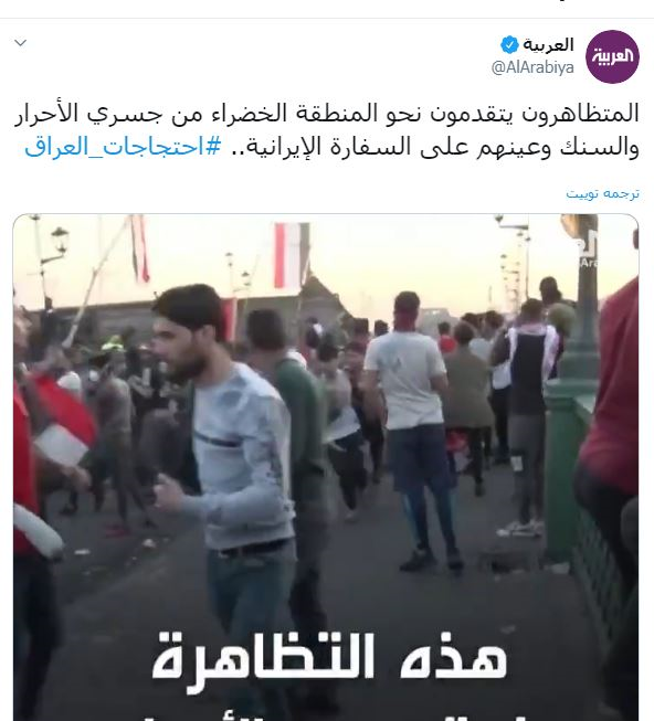 و تحت عنوان "المتظاهرون يتقدمون نحو المنطقة الخضراء من جسري الأحرار والسنك وعينهم على السفارة الإيرانية." نشرت القناة السعودية تغريدة مع فيديو على "تويتر" في تحريض رسمي لمهاجمة السفارة الايرانية.