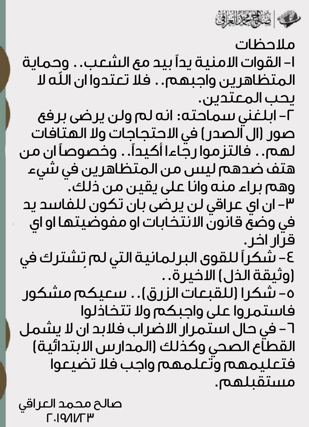 2 - ابلغني سماحته: انه لم ولن يرضى برفع صور (ال الصدر) في الاحتجاجات ولا الهتافات لهم.. فالتزموا رجاء أكيداً.. وخصوصاً ان من هتف ضدهم ليس من المتظاهرين في شيء وهم براء منه وانا على يقين من ذلك.