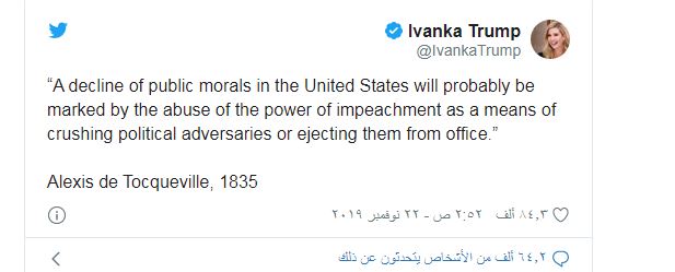 وكتبت إيفانكا: "من المحتمل أن يتسم تراجع الأخلاق العامة في الولايات المتحدة بإساءة استخدام سلطة المساءلة كوسيلة لسحق الخصوم السياسيين أو طردهم من مناصبهم". وقالت إن التغريدة هي اقتباس من كلمات المؤرخ الفرنسي ألكسي دو توكفيل.
