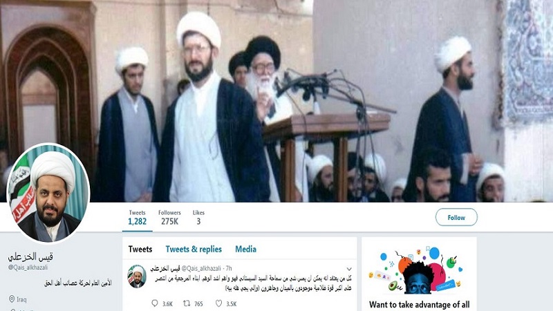 وقال الخزعلي في تغريدة له على موقع التواصل الاجتماعي تويتر، "كل من يعتقد انه يمكن ان يمس شيء من سماحة السيد السيستاني فهو واهم اشد الوهم".