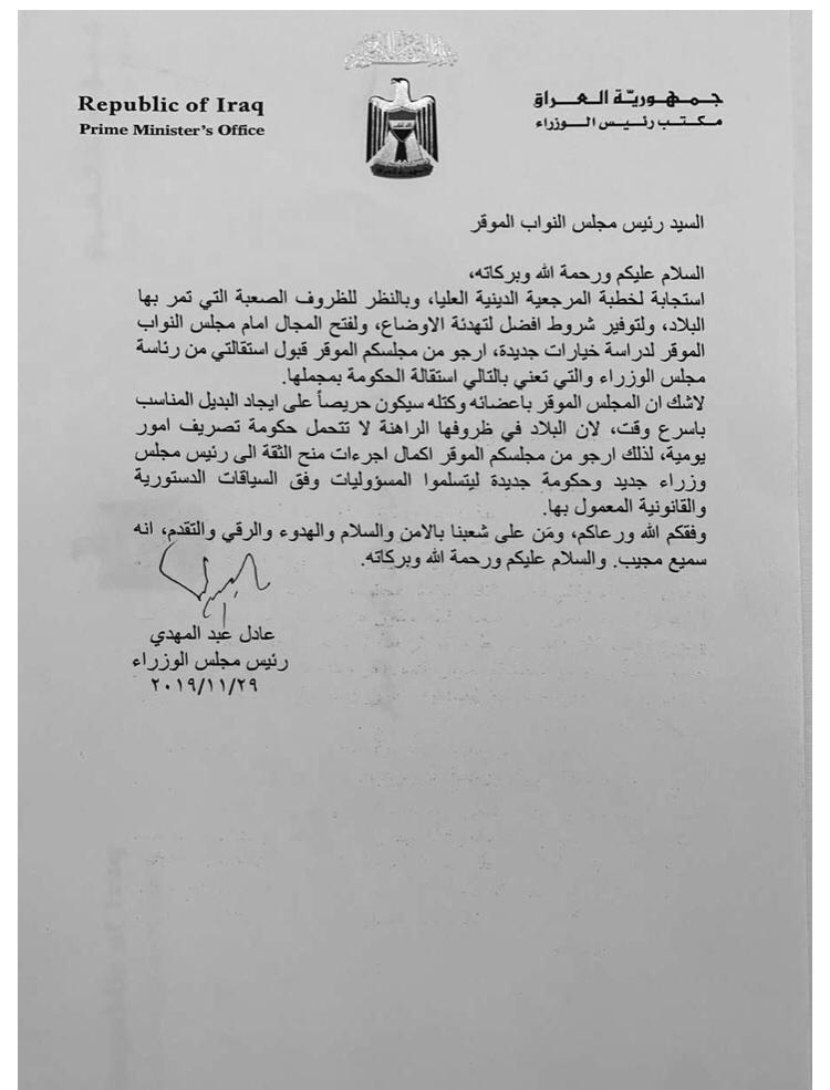 وجاء في نص الاستقالة الموجهة الى رئيس البرلمان انه "استجابة لخطبة المرجعية الدينية وبالنظر للظروف الصعبة التي تمر بها البلاد، ولتوفير شروط افضل لتهدئة الاوضاع، ولفتح المجال امام مجلس النواب الموقر لدراسة خيارات جديدة، ارجو من مجلسكم الموقر قبول استقالتي من رئاسة مجلس الوزراء والتي تعني بالتالي استقالة الحكومة بمجملها".