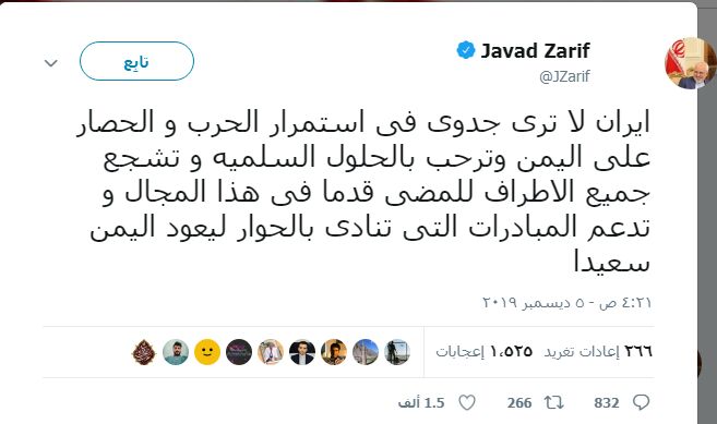 اعلن ذلك ظريف خلال تغريدة له باللغة العربية نشرها على موقع التواصل الاجتماعي "تويتر" اكد من خلالها أن ايران “لا تری جدوی فی استمرار الحرب والحصار علی الیمن وترحب بالحلول السلمیة وتشجع جمیع الأطراف للمضي قدما في هذا المجال”.