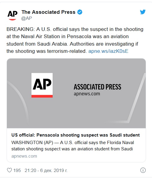 وقال مسؤولان بوزارة الدفاع الأمريكية لوكالة رويترز، طلبا عدم الكشف عن هويتهما إن من المعتقد أن مواطنا سعوديا يتدرب في الولايات المتحدة هو المشتبه به في حادث إطلاق النار المميت في قاعدة بينساكولا الجوية، وهي قاعدة رئيسية تابعة لسلاح البحرية الأمريكية في ولاية فلوريدا.
