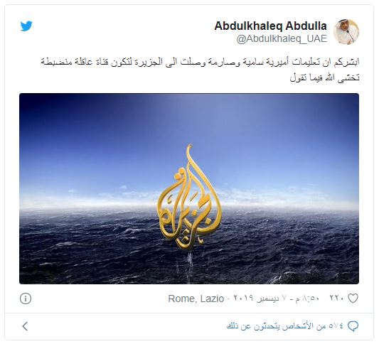 وأكد المستشار السابق لولي عهد أبو ظبي، عبر حسابه على "تويتر"، أن تعليمات محددة وصلت إلى قناة الجزيرة بضرورة التحلي بالحيادية، قائلا: "أبشركم أن تعليمات أميرية سامية وصارمة وصلت إلى الجزيرة لتكون قناة عاقلة منضبطة تخشى الله فيما تقول"، بحسب وصفه.