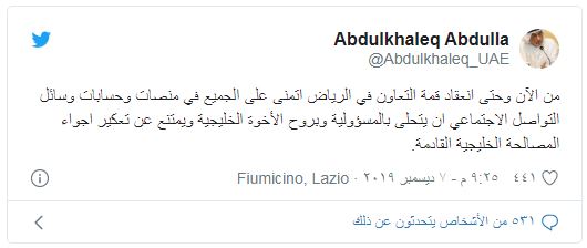 وأضاف: "من الآن وحتى انعقاد قمة التعاون في الرياض، أتمنى على الجميع في منصات وحسابات وسائل التواصل الاجتماعي أن يتحلى بالمسؤولية وبروح الأخوة الخليجية ويمتنع عن تعكير أجواء المصالحة القادمة".