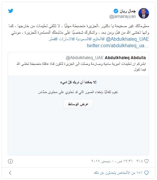 من جانبه، رد مذيع الجزيرة "جمال ريان" على الدكتور عبد الخالق عبدالله، وقال عبر حسابه على "تويتر": "معلوماتك غير صحيحة يا دكتور، الجزيرة منضبطة مهنيا، لا تتلقى تعليمات من خارجها، كما وأنها تخشى الله من قبل ومن بعد، وأشكرك شخصيا على متابعتك المستمرة للجزيرة، مودتي".