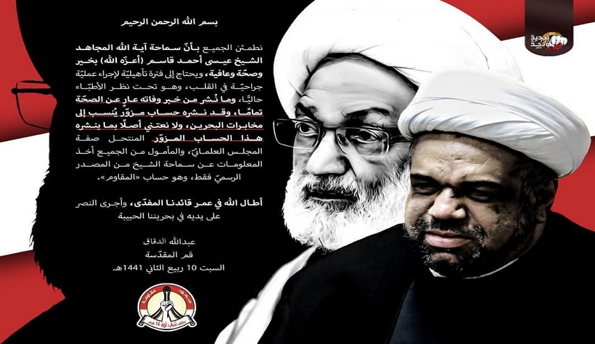 وأمل سماحته من الجميع أخذ المعلومات عن سماحة الشيخ من المصدر الرسميّ فقط، وهو حساب «المقاوم»، داعيًا للشيخ عيسى بطول العمر وتحقيق النصر في البحرين على يديه.
