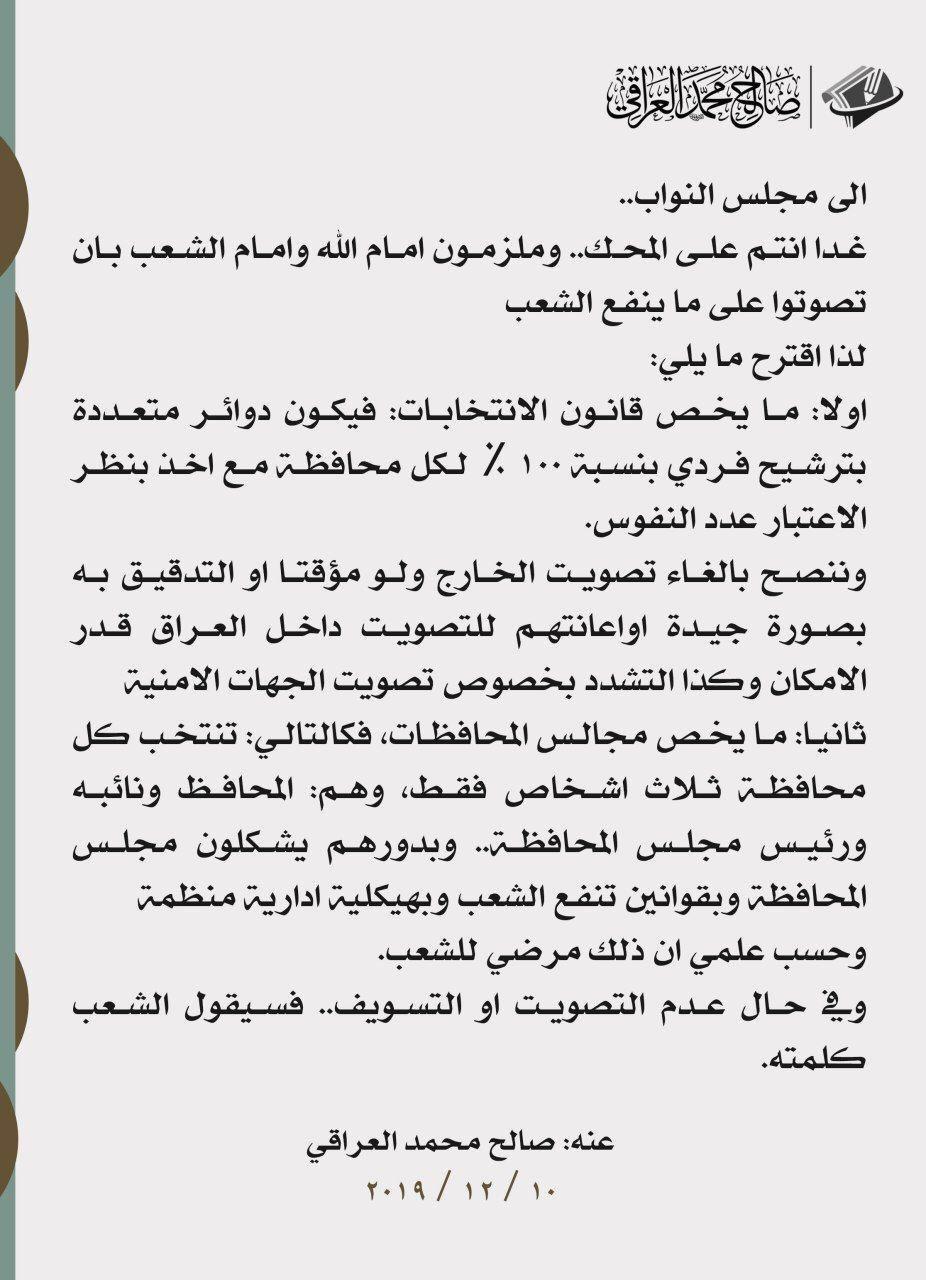 اولا: ما يخص قانون الانتخابات: فيكون دوائر متعددة بترشيح فردي بنسبة 100% لكل محافظة مع الاخذ بنظر الاعتبار عدد النفوس.
