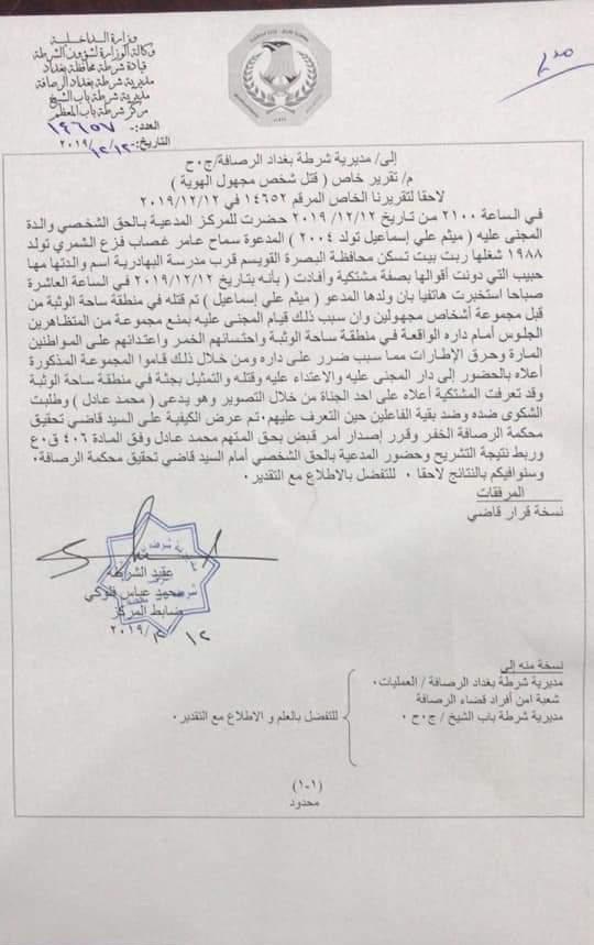 تقدمت والدة الفتى المقتول في ساحة الوثبة وسط العاصمة بغداد بشكوى الى الشرطة ضد المتورطين بالجريمة.