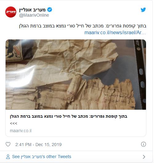 وعثر المستوطن الإسرائيلي “هاروش” وولده بداخل علبة الثقاب (علبة الكبريت) على رسالة ممزقة لمجند سوري، تعود للعام 1967، وبجوارها علبة دواء، وزجاجات أخرى ـ دون ذكر تفاصيلها ـ ويبدو أن هذه الرسالة لمجند سوري (الأب) يرسلها لعائلته، وتقريبا لابنه، أو ربما لشخص آخر، دون ذكر تفاصيل أخرى توضح ماهية الرسالة ومضمونها.