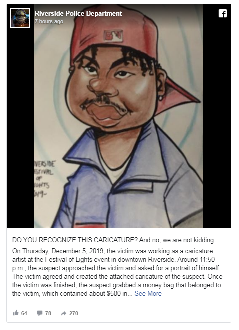 وكان الضحية يعمل كفنان كاريكاتير وحضر مهرجان الأضواء في مدينة ريفرسايد على هذا الأساس، وحوالي الساعة 11:50 مساء اقترب اللص من الضحية وطلب صورة لنفسه، وافق الضحية وبدأ برسم الكاريكاتير للص، وبمجرد الانتهاء من الضحية، أمسك اللص بحقيبة الضحية، التي تحتوي على نحو 500 دولار نقدا، وهرب بين الجماهير وترك صورته مع الفنان.