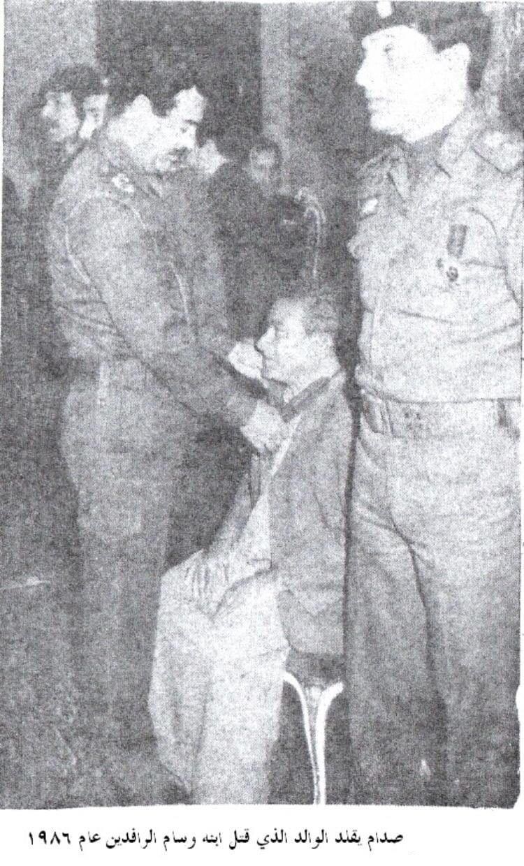 الصورة لصدام وهو يكرم شخص من الصويرة اسمه "هشام محمد علي" وتعود لسنة 1986 وسبب التكريم يعود لان الاب قام بقتل ابنه الهارب من الخدمة العسكرية .