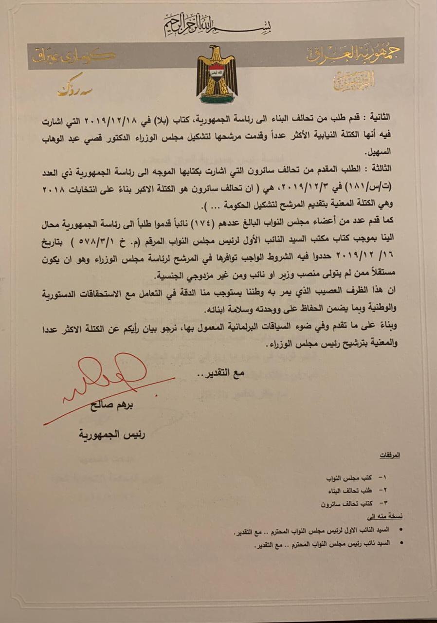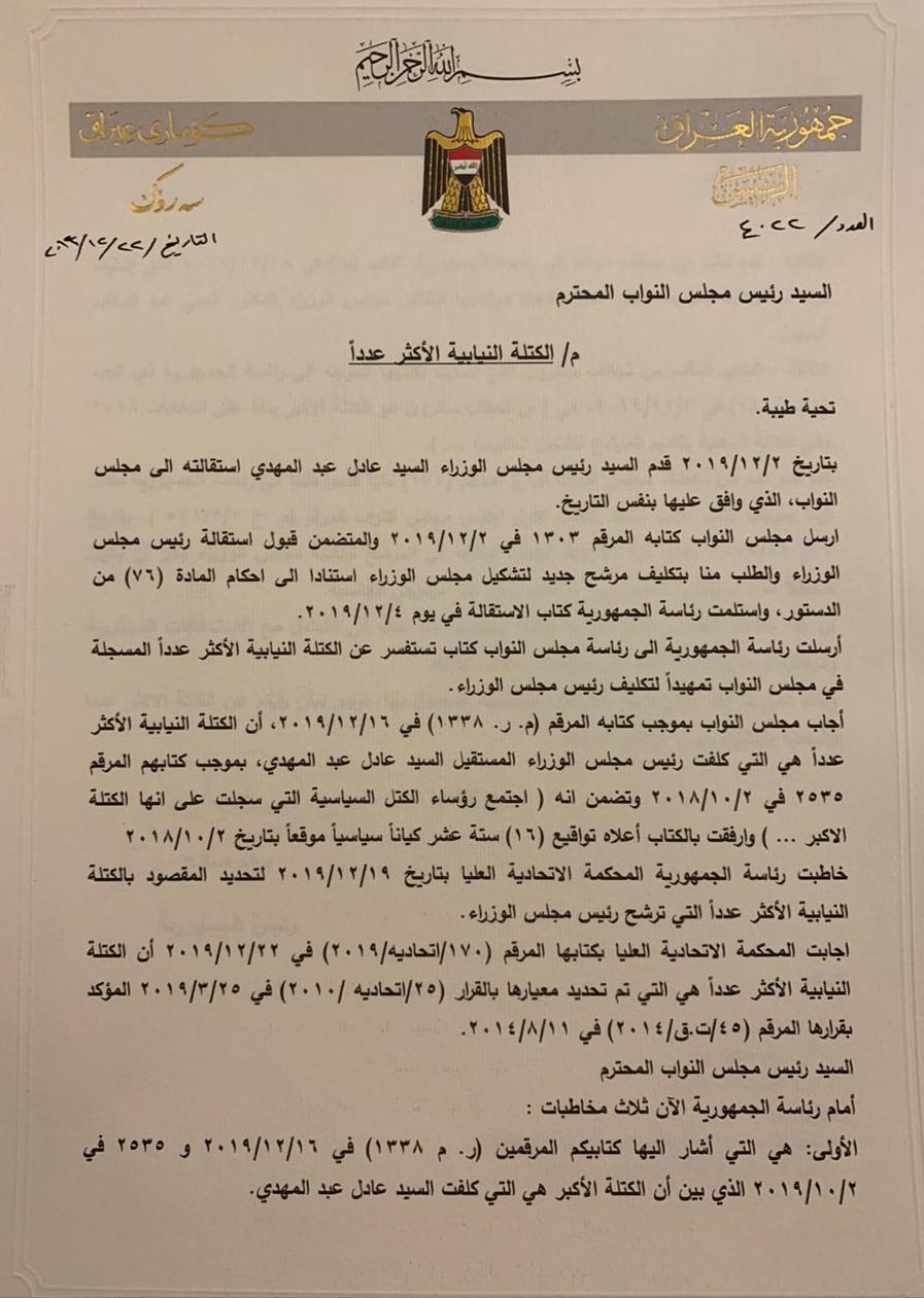 مجددآ... الكتاب المرسل من رئيس الجمهورية العراقي إلى البرلمان بشأن تسمية الكتلة الأكبر +الوثيقة