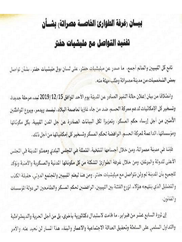 وبحسب موقع "بوابة ليبيا "، فقد جاء ذلك بعد بيان الناطق باسم القيادة العامة أحمد المسماري ذكر فيه تمديد المهلة الممنوحة لمدينة مصراتة ثلاثة أيام أخرى غير قابلة للتمديد مرة أخرى وسوف توجه قوات الكرامة قصف غير مسبوق ضد مدينة مصراتة لاجبارها على الانسحاب من طرابلس وسرت.
