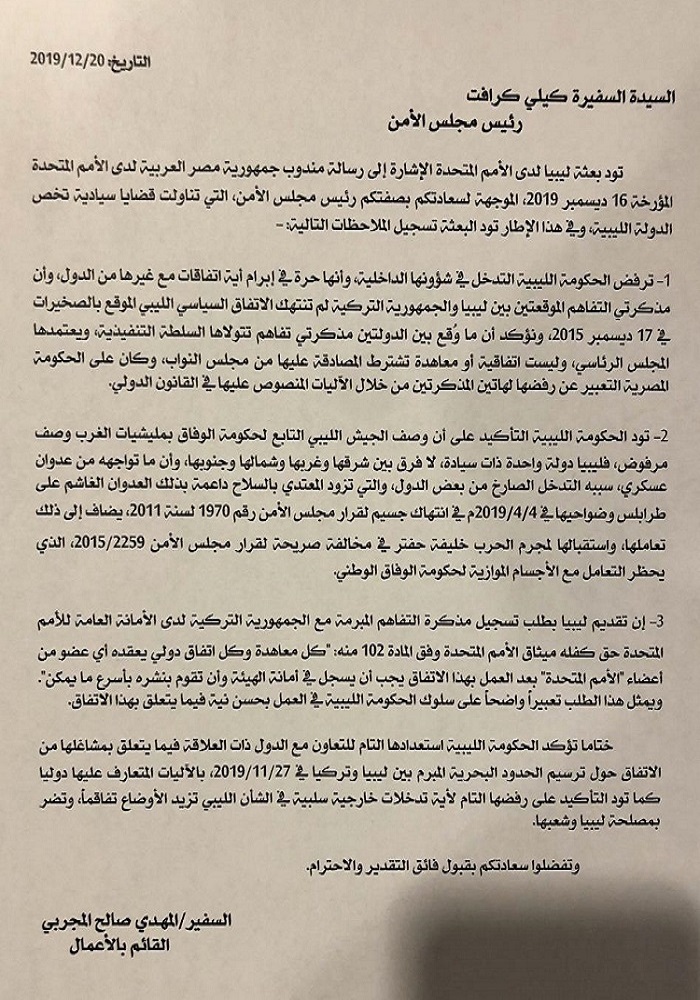 ونوهت البعثة الليبية بأنه كان على مصر التعبير عن رفضها للمذكرتين عن طريق الآليات المنصوص عليها في القانون الدولي، مؤكدة أن الحكومة المصرية، هي من ينتهك القانون الدولي بتعاملها مع حفتر ودعمه بالسلاح والعتاد.