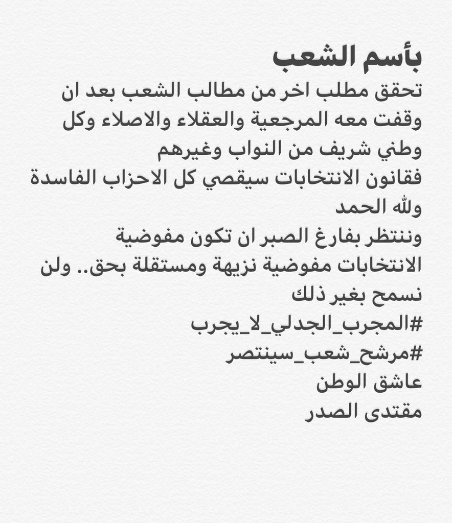 وختمل الصدر قائلا " ننتظر بفارغ الصبر ان تكون مفوضية الانتخابات مفوضية نزيهة ومستقلة بحق.. ولن نسمح بغير ذلك".