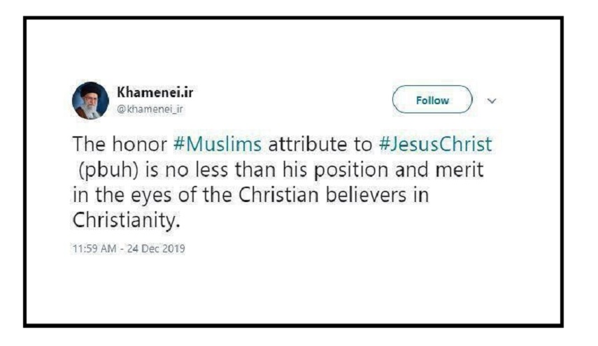 حيث نشرموقع مکتب سماحة القائد آية الله العظمى الخامنئي تغريدة لسماحته ، باللغة الانجليزية ، بمضمون: ( احترام "يسوع المسيح" عند المسلمين لايقل عن مكانته عند المؤمنين المسيحيين من اتباعه).