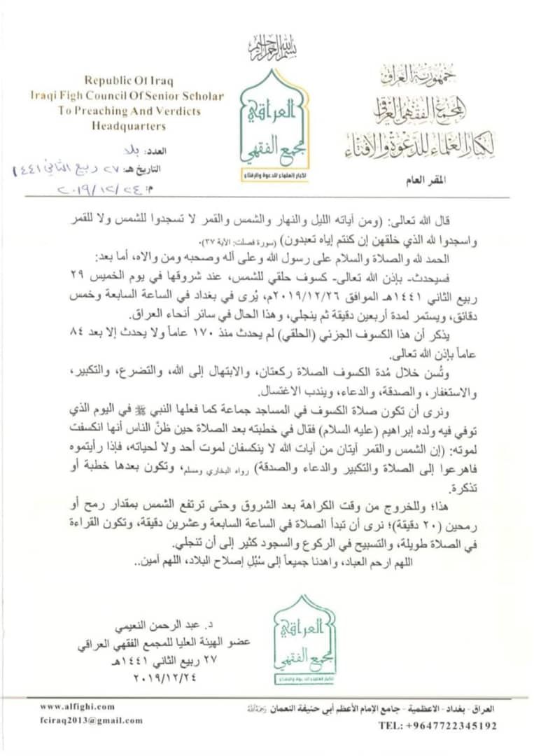وستكون مرئية في معظم بلدان العالم العربي وفي عموم العراق ايضاً، مبيناً ان ” الكسوف الجزئي سيظهر في الساعة
