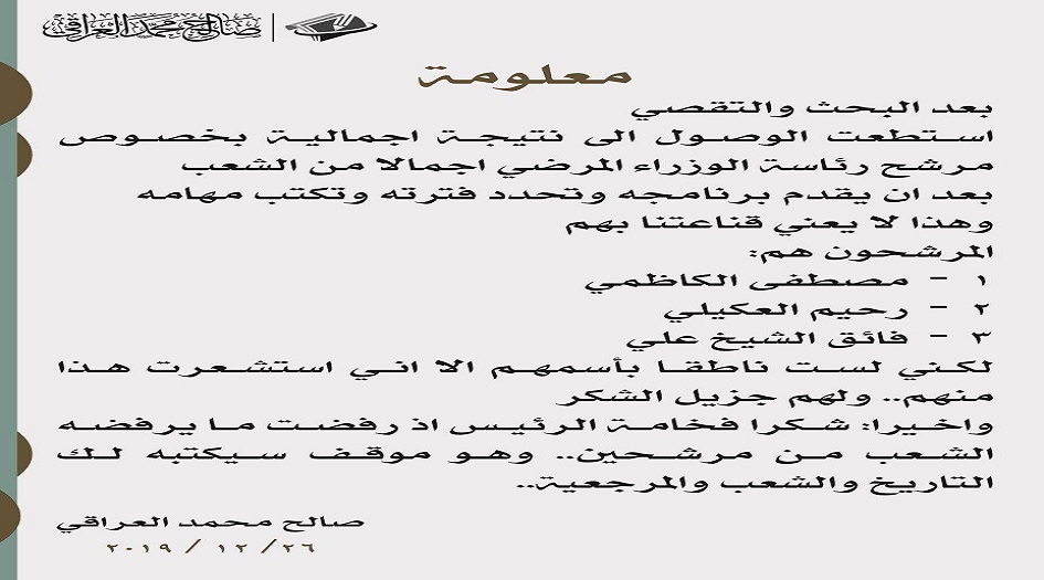 وأضاف "المرشحون هم {مصطفى الكاظمي، رحيم العكيلي، فائق الشيخ علي} لكني لست ناطقا بأسمهم الا اني استشعرت هذا منهم ولهم جزيل الشكر".