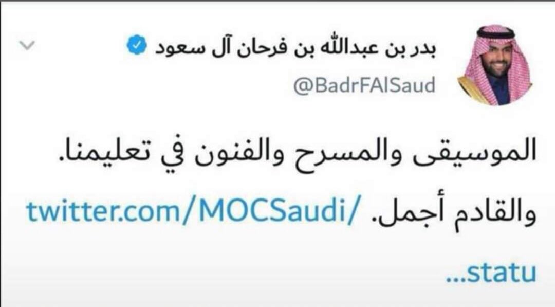 وكتب بن فرحان: "الموسيقى والمسرح والفنون في تعليمنا. والقادم اجمل"!، قبل ان يحذفها من صفحته.