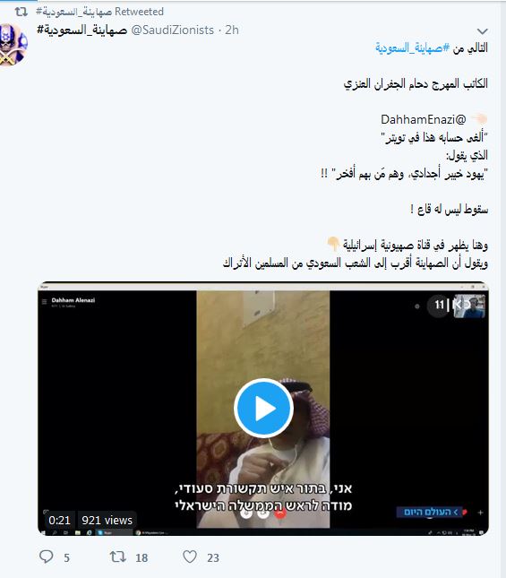 وكان الكاتب والاعلامي السعودي المطبع "دحام الجفران" قد كتب في تغريدة سابقة، " يهود خيبر أجدادي، وهم من بهم أفخر"