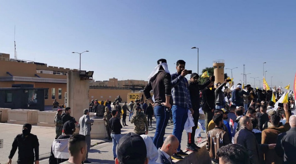 وقالة وكالة سبوتنيك إن "المحتجين أشعلوا حريقا بالسياج الخارجي للسفارة الأمريكية في بغداد بعد أن تجمهر المئات منهم عند البوابة الخارجية للسفارة داخل المنطقة الخضراء".