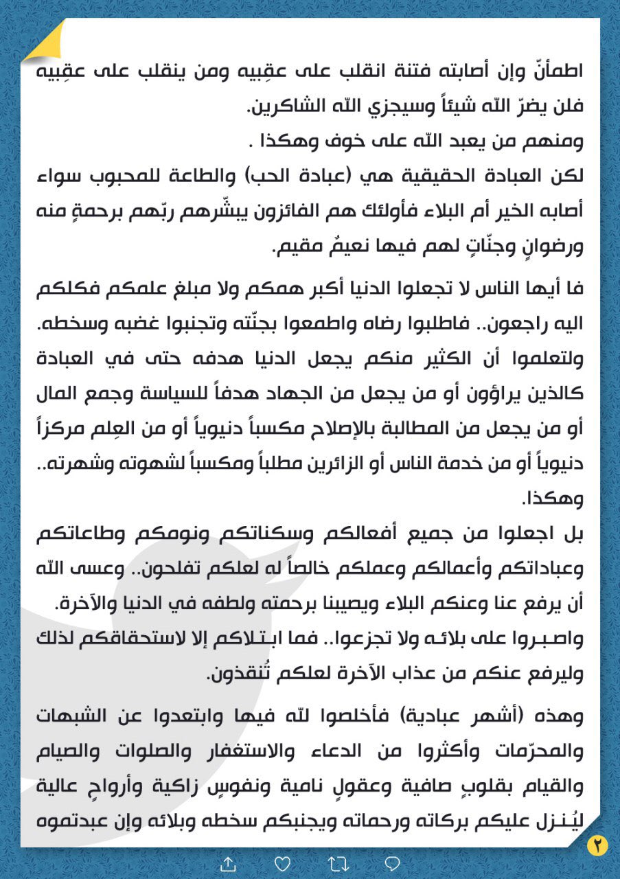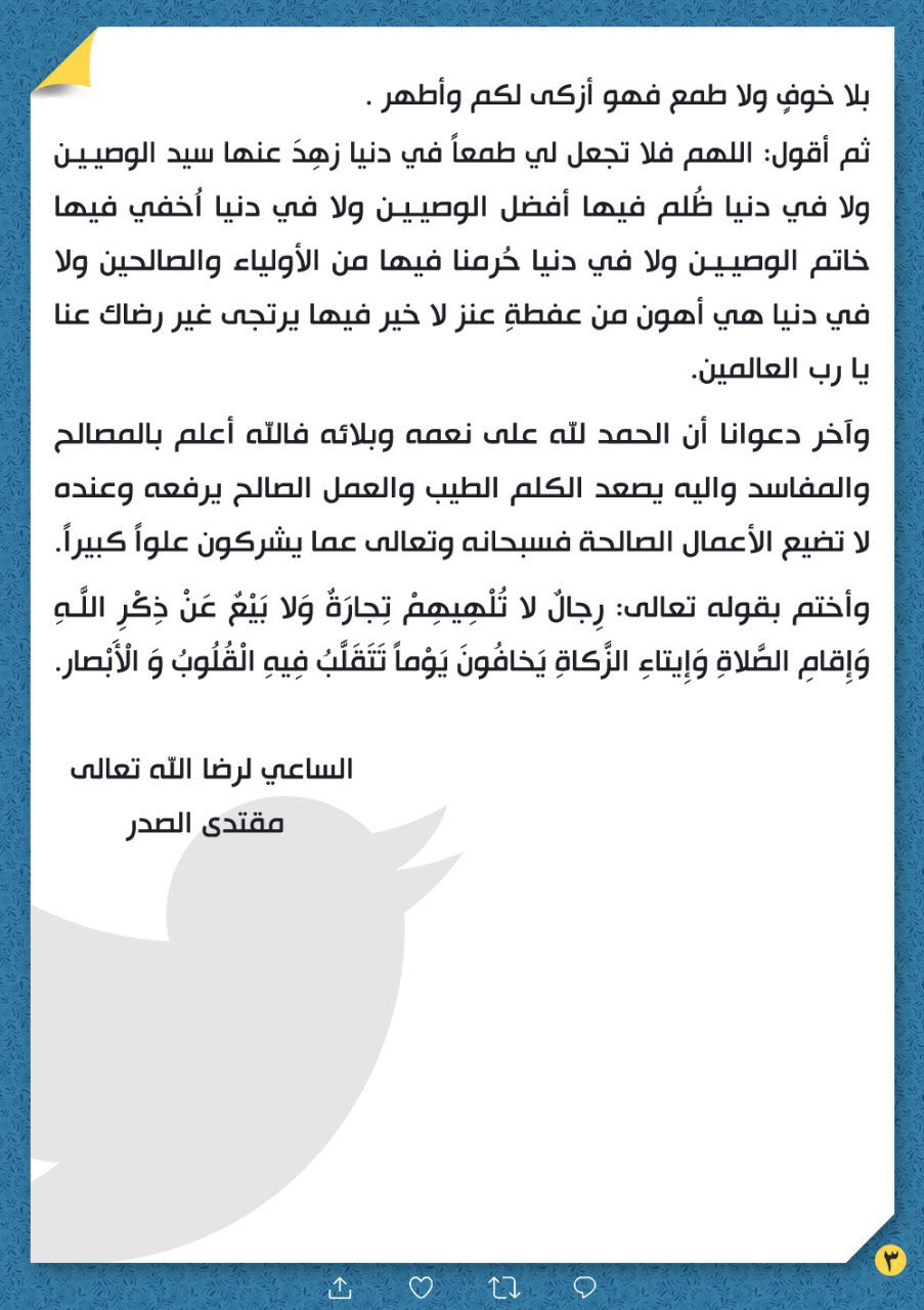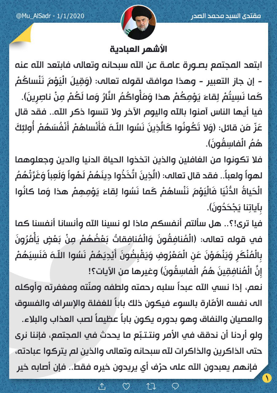 جاء ذلك في تغريدة للصدر نشره على حسابه في "تويتر"، اليوم، (1 كانون الثاني 2020).
