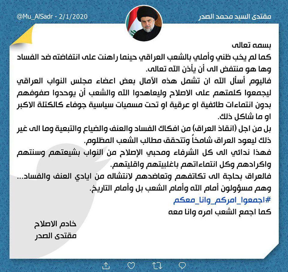 وأوضح الصدر، :"هذا ندائي الى كل الشرفاء ومحبي الإصلاح من النواب بشيعتهم وسنتهم واكرادهم وكل انتماءاتهم باغلبيتهم واقليتهم. فالعراق بحاجة الى تكاتفهم وتعاضدهم لانتشاله من ايادي العنف والفساد... وهم مسؤولون أمام الله وأمام الشعب بل وأمام التاريخ، أجمعوا أمركم وأنا معكم، كما أجمع الشعب امره وانا معه".