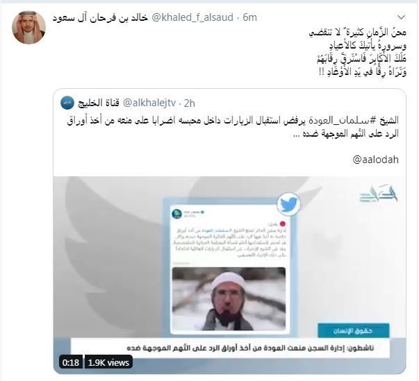 وياتي ما نشره حساب خالد بن فرحان آل سعود تأكيدا على ما نشره سابقا حساب "معتقلي الرأي" في تغريدة على تويتر، إن "إدارة سجن الحائر (جنوب الرياض) منعت العودة من أخذ أوراق خاصة به أعدّ فيها الرد على التُهم الجائرة الموجهة ضده".