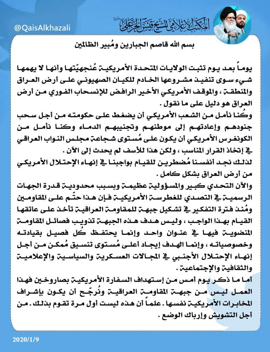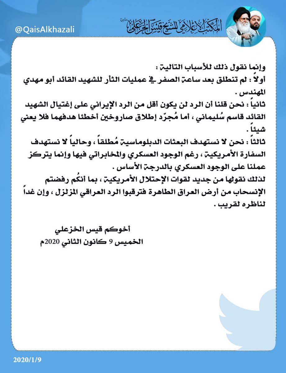 ونفى الخزعلي نية "المقاومة العراقية" استهداف اي بعثة دبلوماسية، فيما اشار الى أن ساعة الصفر لعمليات الثأر لأبي مهدي المهنس لم تنطلق بعد، مجددا التهديد برد مزلزل.