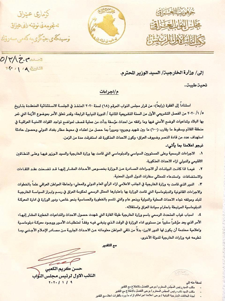 طالب النائب الأول لرئيس مجلس النواب العراقي، حسن الكعبي، الخميس، وزير الخارجية محمد علي الحكيم، بإعلامه عن اجراءات الوزارة ازاء القصف الأميركي، لمعسكر الحشد الشعبي في قضاء القائم، والقصف الامريكي الغادر الذي استهدف نائب رئيس هيئة الحشد الشعبي، الشهيد أبو مهدي المهندس، وقائد فيلق القدس في حرس الثورة الاسلامية الفريق الشهيد قاسم سليماني بالقرب من مطار بغداد.