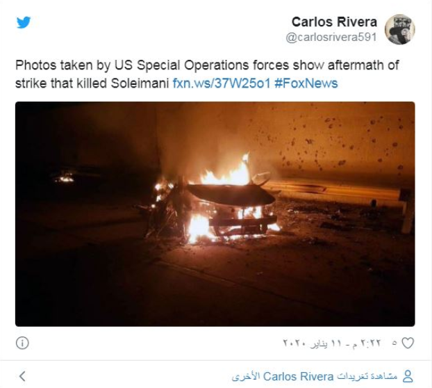 وأكد موقع “فوكس نيوز” الذي نشر الصور أن جنودا من قوات العمليات الخاصة الأمريكية في العراق كانوا يرصدون موكبا يقل الشهيد سليماني عن بعد نصف ميل، ثم وصلوا إلى موقع الاستهداف بعد وقوعه بأقل من دقيقتين وأدوا ما يعرف بـ “تقييم أضرار التفجير”، والتقطوا صورا للمكان تؤكد أن الطائرة المسيرة أصابت السيارة المستهدفة، وأن سليماني فارق الحياة.