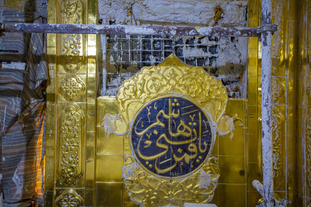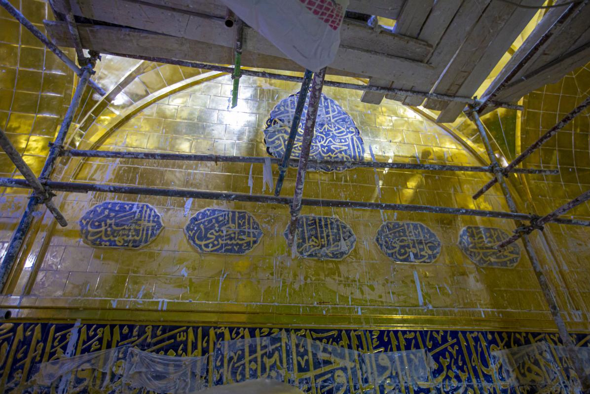 وتم وضع بلاطات في اسفل الايوان كما تم تذهيب سقف الايوان وأعيد إعماره باستخدام بلاطات منقوشة بآيات من القرآن الكريم.