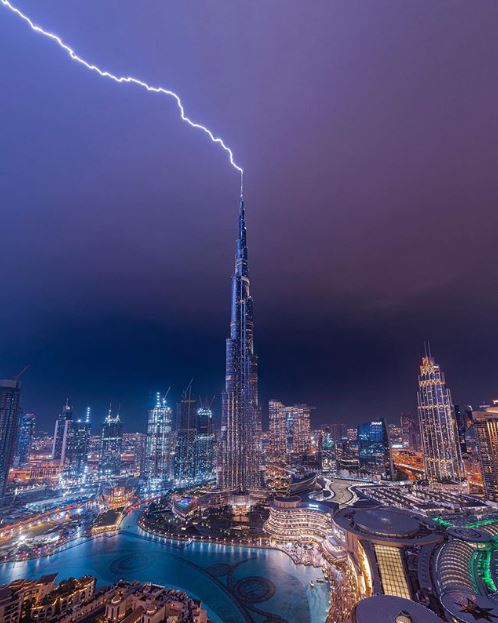 نشر الشيخ حمدان بن محمد بن راشد آل مكتوم على الانستغرام صورة لضربة صاعقة لأعلى ناطحة سحاب في الإمارات، برج خليفة.