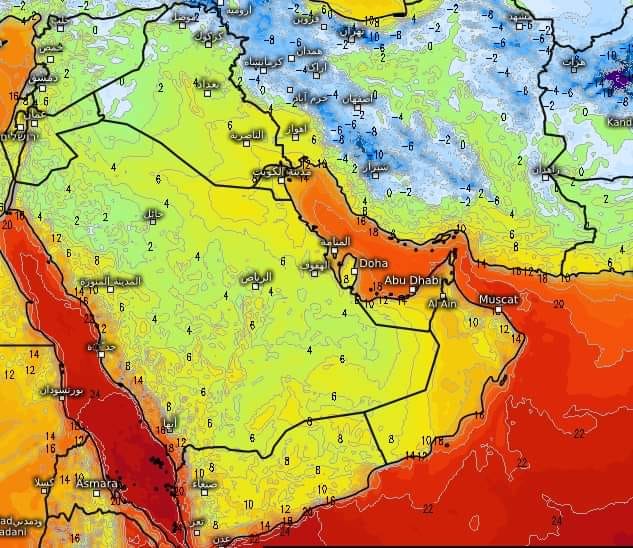 وهذه خارطة بدرجات الحرارة صباح اليوم ، تظهر ان موجة البرد ما زالت مستمرة وتحديدا شمال وغرب البلاد.